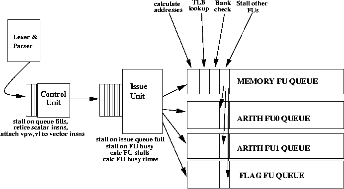 The memory system will keep a queue per bank (or sub-bank as the case may be.) It will return the stall cycles for the memory accesses on the same bank to the memory functional unit. It will also have to deal with any cache fills from the scalar core cache misses and any virtual memory macro TLB misses that need to be loaded up from memory. The stall cycles will be passed back for each of the memory accesses to the system as you always know how many cycles the current memory access is going to take and the how many cycles each one in front in the queue of the given memory access will take. This can then be used by the memory functional unit to stall the issue unit and the other units. |